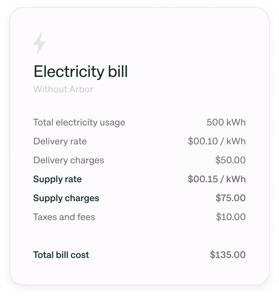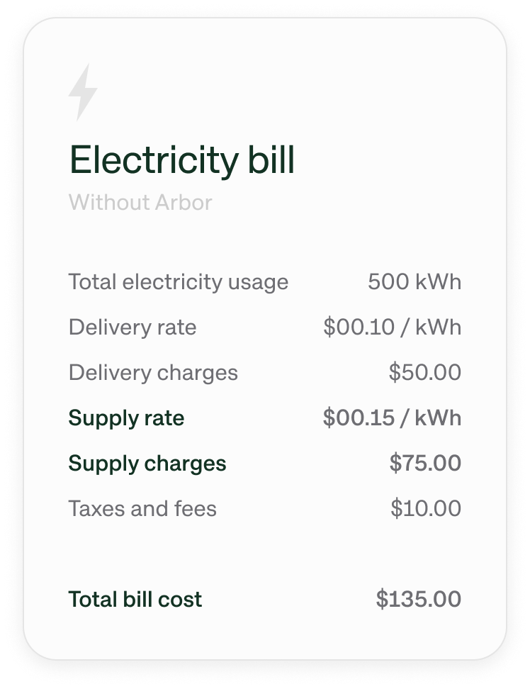 Arbor finds and secures lower rates for you, and is available to renters and homeowners. You pay your same usual bill to your utility, but with a lower rate from an electricity supplier vetted by Arbor.